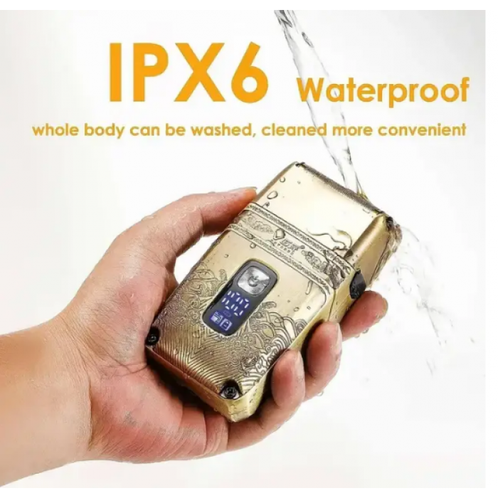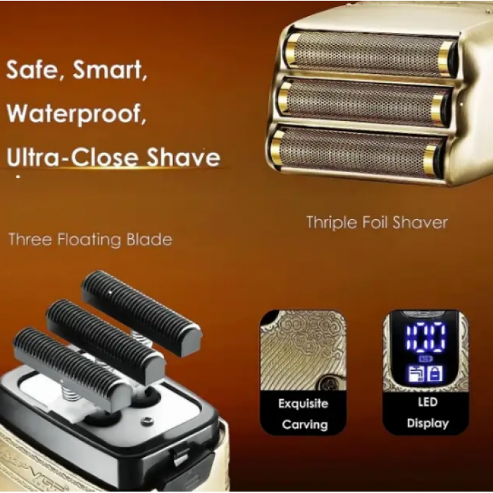 Електробритва: леза виготовлені з високоякісної нержавіючої сталі, потрійна сітка, з можливістю відкрити ножовий блок, для більш ретельного очищення, працює 80 хвилин від акумуляторів ємністю 700 мАг, заряджається за 1,5 години, корпус пристрою виготовлено з металу. Висувний триммер вбудований у корпус і є не знімним.