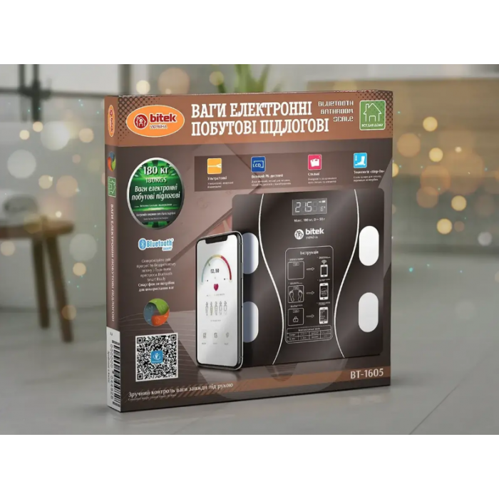 Ваги електронні побутові підлогові 180кг скляні квадратні LED екран App BITEK BT-1605