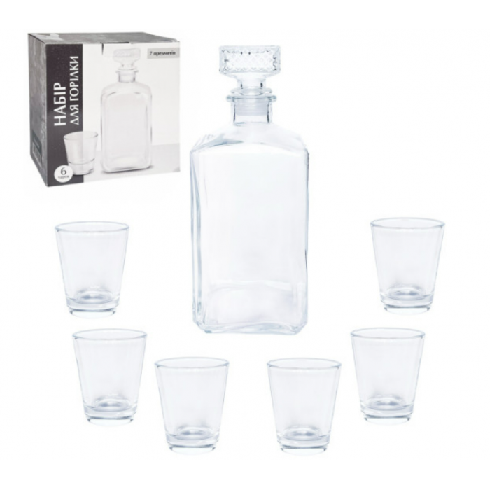 Матеріал: скло, пластик (пробка). Об'єм та розмір: графин 620мл 7,7х7,7х18,7см, стопка 50мл 5х5х6см. Форма: графин - прямокутна; стопка - кругла з конусоподібними стінками. Кількість предметів: 7 - 1 графин і 6 стопок. Колір: прозорий. Графин щільно закривається пробкою з прямокутною скляною ручкою, прикрашеною рельєфним візерунком. Даний графин зможе надійно зберігати напої. Виглядає сучасно і стильно. Після використання ємність швидко омивається, не залишається запахів і присмаку від минулої рідини. Упаковано в коробку 18х8х19,5см.