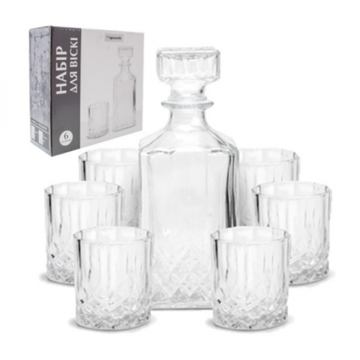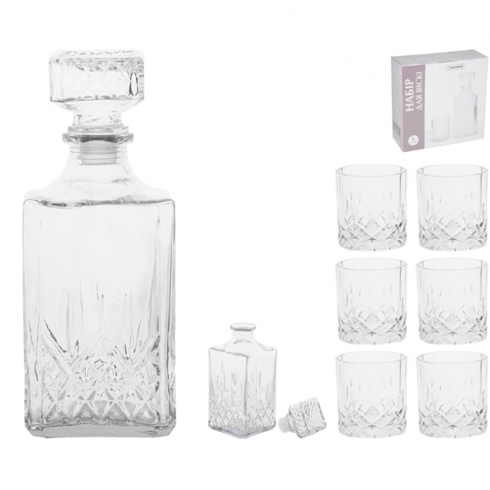 Графин щільно закривається пробкою з прямокутною скляною ручкою. Поверхня графина і склянок прикрашена рельєфним візерунком. Даний графин зможе надійно зберігати напої. Виглядає сучасно і стильно. Так як поверхня прозора, є можливість відразу зрозуміти, що зберігається всередині. Після використання ємність швидко омивається, не залишається запахів і присмаку від минулої рідини. Упаковано в коробку 25х9,5х24см.