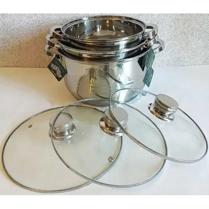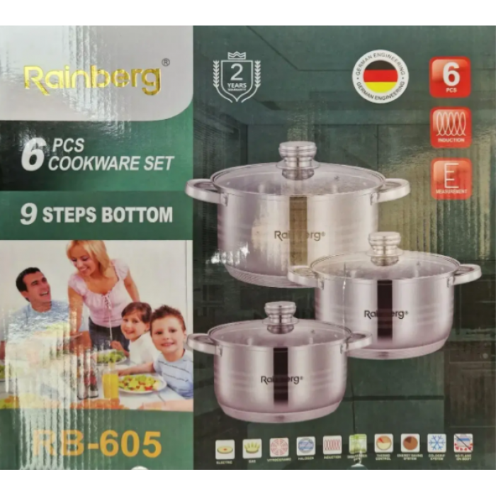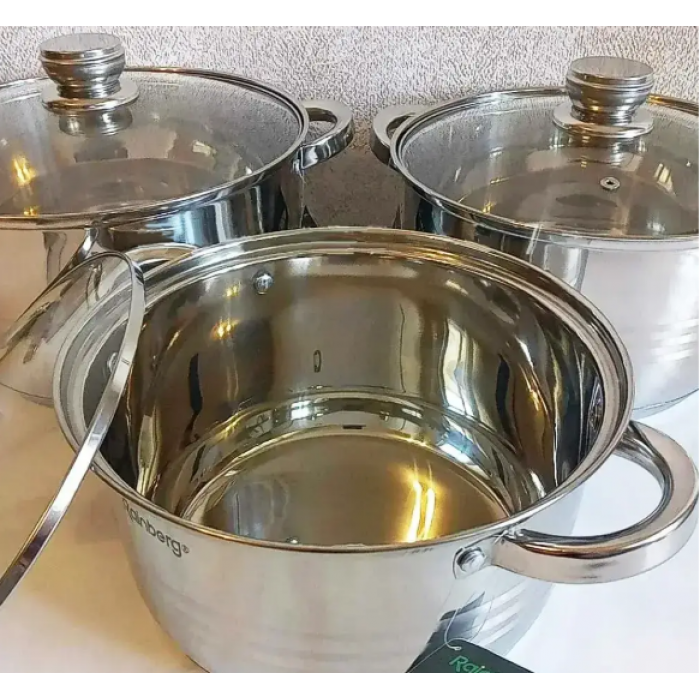 Набір Rainberg RB-605 складається з 3-х каструль: 6,3л, 7,1л, 9,4л та 3-х скляних кришок.