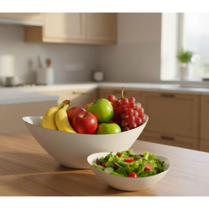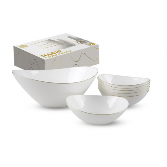 Особливістю цього набору є витончений золотий кант, який обрамляє краї кожного предмета, забезпечуючи для візуального підкреслення елегантності та для надання столу аристократичного вигляду. Комплект включає одну велику чашу об'ємом 1.8 літра для подачі основного салату або гарячих страв, а також шість порційних салатників об'ємом по 400 мл для індивідуальної подачі закусок, соусів чи десертів. Завдяки більшому об’єму порційних салатників, вони є універсальними для використання під час більшості сімейних свят.