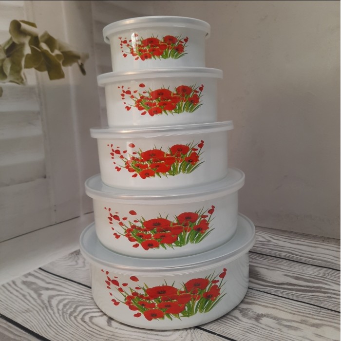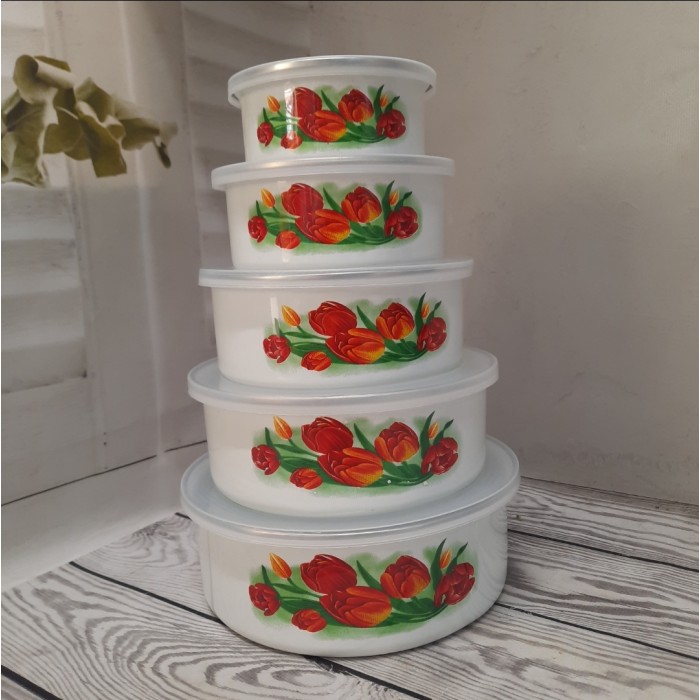 Пропонуємо купити набір круглих харчових контейнерів/судків з пластиковими кришками. Виготовлені із сталі покритою білою емаллю, прикрашені яскравим квітковим малюнком. Місткості екологічні, можна використати і для приготування, і для перенесення блюд. Завдяки пластиковим кришкам, в місткостях зручно зберігати продукти і приготовані блюда.